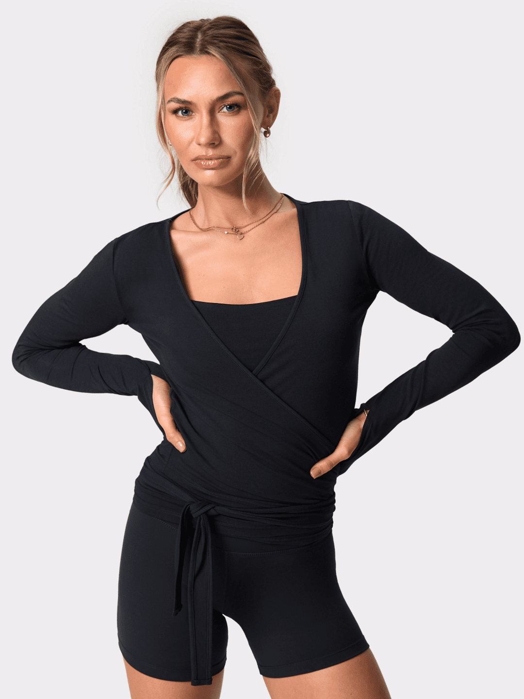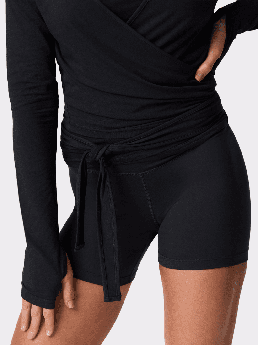 The Bamboo Wrap Top blends comfort with a confident fit. A deep V-neck and wrap-around ties create a flattering, effortless silhouette.